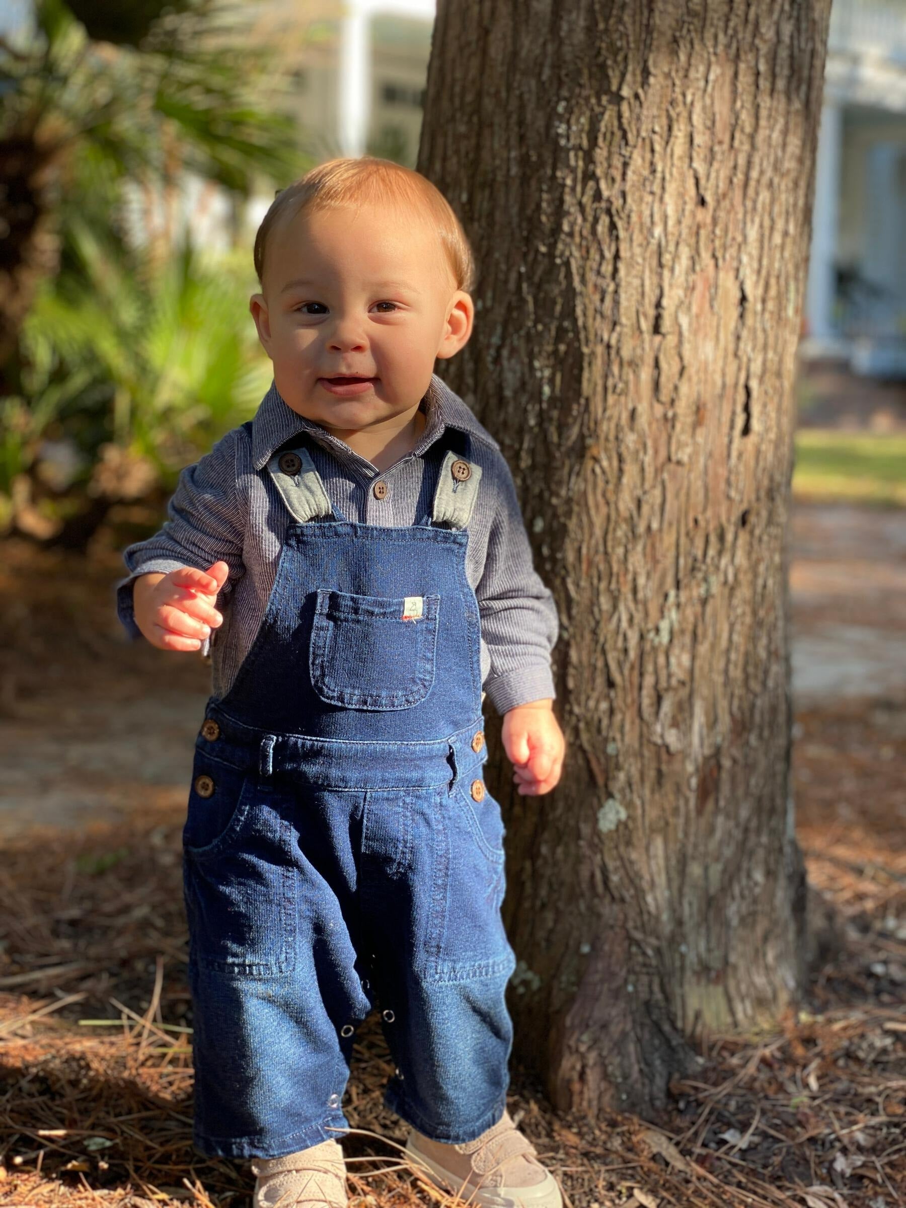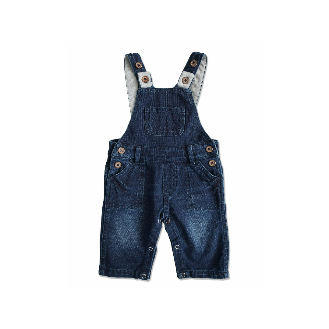 Another classic pair of overalls for your baby boy. It features lots of working buttons and pockets and in a dark wash denim look. These would pair well with any onesie, polo onesie, or a woven polo onesie.